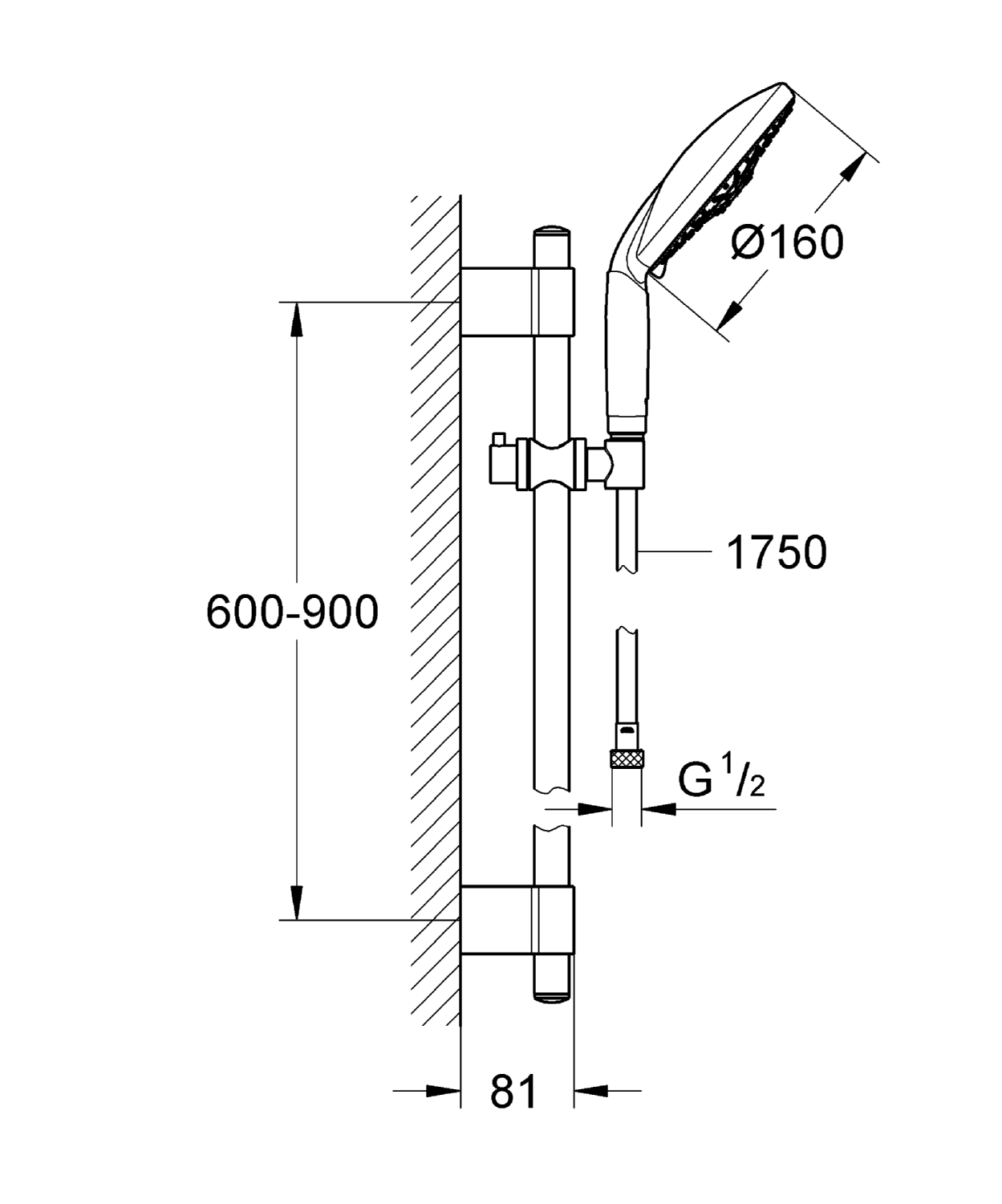 De handdouche heeft een diameter van 160 mm, de afstand van het hart van het ene bevestigingspunt van de glijstang naar het hart van het andere bevestigingspunt bepaal je zelf tussen de 600 en 900 mm. De handdouche heeft een universele bevestiging en de slang past op alle standaard douchekranen (1/2" aansluiting).