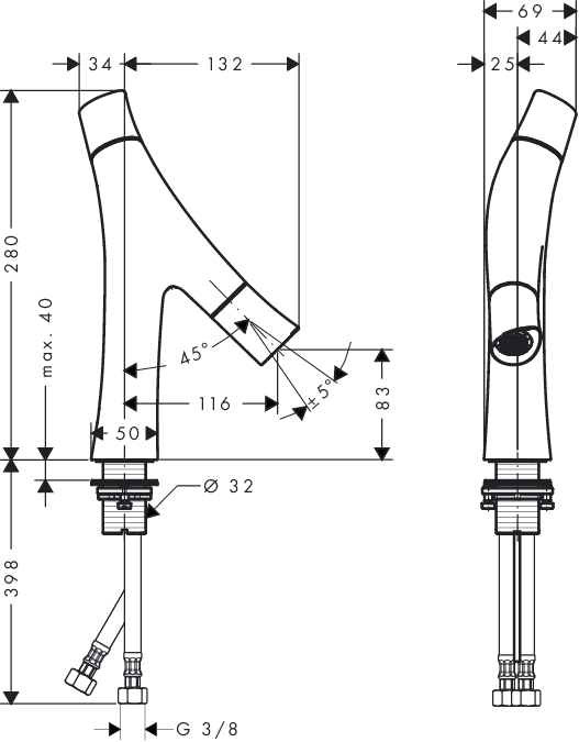 - De diameter van het kraangat is 32 mm