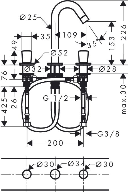 - De diameter van het kraangat is 34 mm