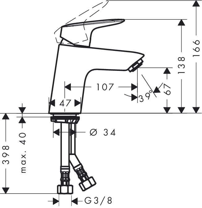 - De diameter van het kraangat is 34 mm